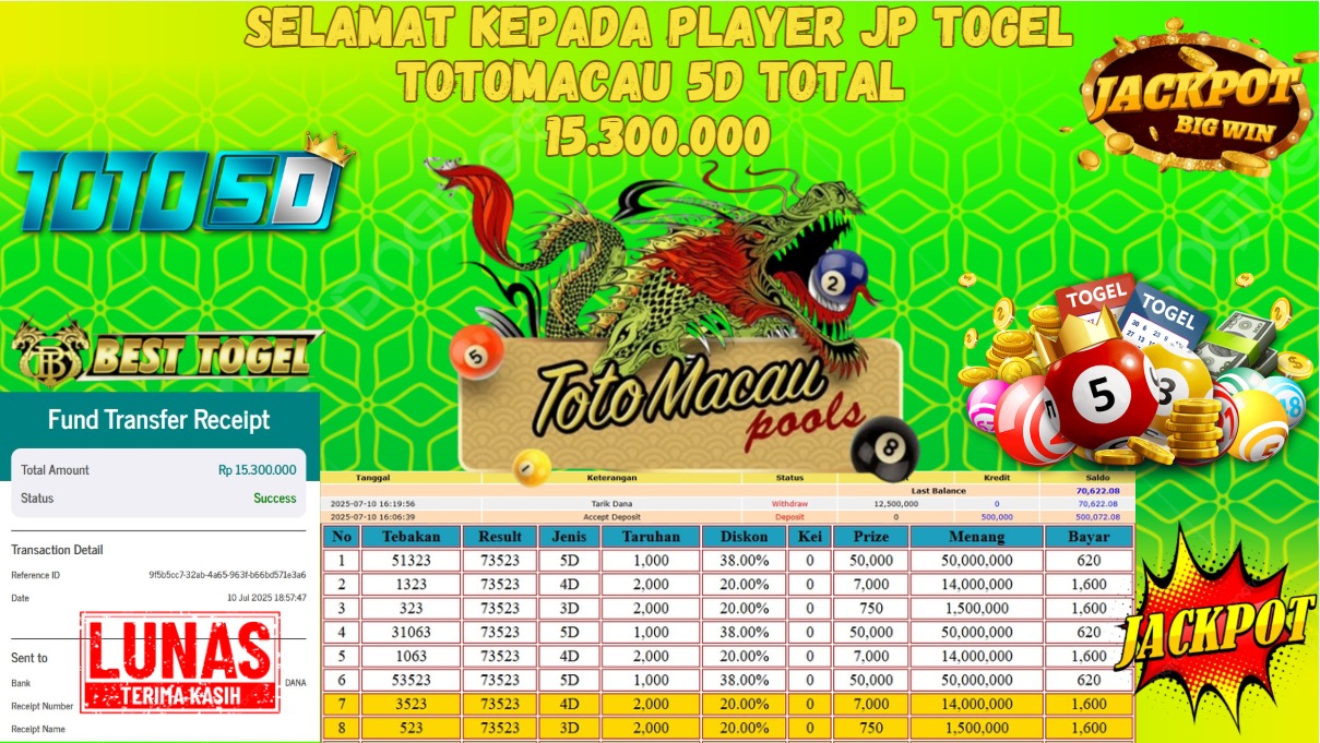 Selamat kepada User id : OP***** Telah berhasil mendapatkan kemenangan besar pada permainan TOGEL TOTOMACAU 5D dengan total kemenangan Sebesar Rp 15.300.000,- Setelah mengisi formulir withdraw dengan kurung waktu hanya 5 – 10 menit pihak BESTTOGEL sudah melakukan transfer kepada pemilik Userid dan dana sudah dapat di cairkan oleh pemenang. Bukti pembayaran yang kami berikan merupakan bukti pembayaran yang SAH / VALID yang langung di dapatkan melaui tanda transfer transaksi dari Bank yang di tuju.