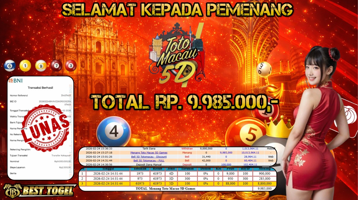 Selamat kepada User id : DVT****** Telah berhasil mendapatkan kemenangan besar pada permainan TOGEL TOTOMACAU 5D dengan total kemenangan Sebesar Rp.9.985.000,– Setelah mengisi formulir withdraw dengan kurung waktu hanya 5 – 10 menit pihak BESTTOGEL sudah melakukan transfer kepada pemilik Userid dan dana sudah dapat di cairkan oleh pemenang. Bukti pembayaran yang kami berikan merupakan bukti pembayaran yang SAH / VALID yang langung di dapatkan melaui tanda transfer transaksi dari Bank yang di tuju.