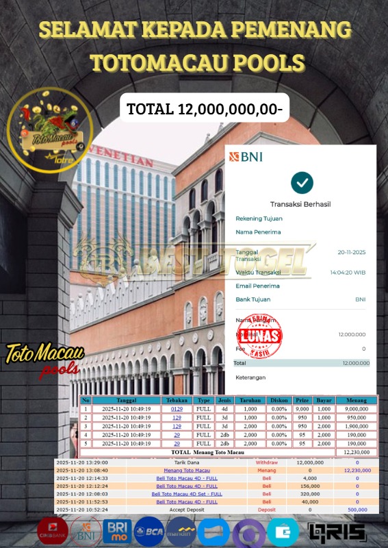 Selamat kepada User id : ROB****** Telah berhasil mendapatkan kemenangan besar pada permainan TOGEL TOTOMACAU POOLS dengan total kemenangan Sebesar Rp 12.000.000 ,- Setelah mengisi formulir withdraw dengan kurung waktu hanya 5 – 10 menit pihak BESTTOGEL sudah melakukan transfer kepada pemilik Userid dan dana sudah dapat di cairkan oleh pemenang. Bukti pembayaran yang kami berikan merupakan bukti pembayaran yang SAH / VALID yang langung di dapatkan melaui tanda transfer transaksi dari Bank yang di tuju.