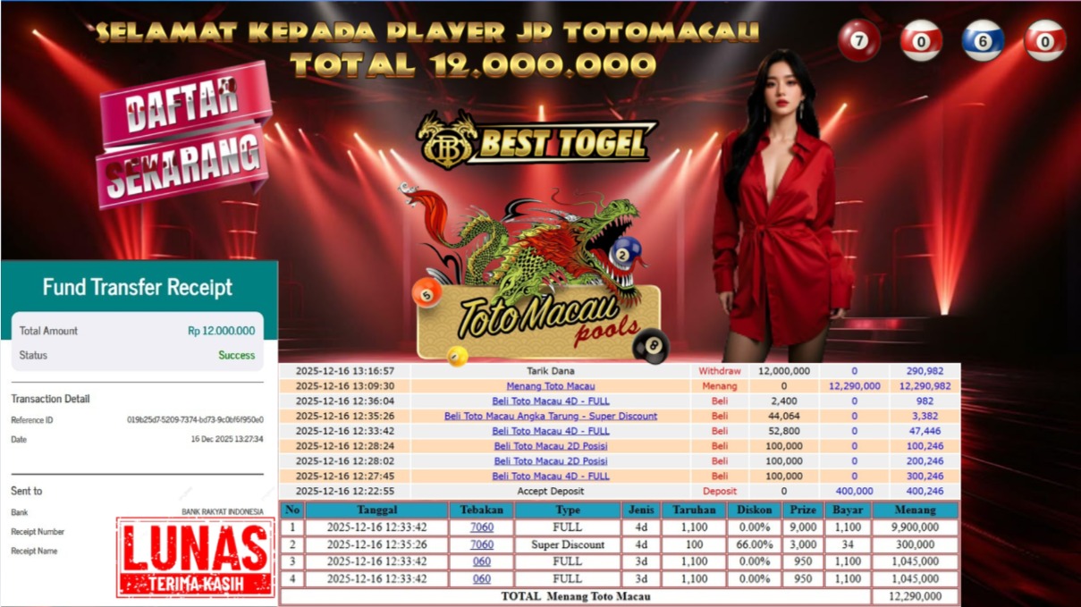 Selamat kepada User id : BRU****** Telah berhasil mendapatkan kemenangan besar pada permainan TOGEL TOTOMACAU dengan total kemenangan Sebesar Rp. 12.000.000 ,- Setelah mengisi formulir withdraw dengan kurung waktu hanya 5 – 10 menit pihak BESTTOGEL sudah melakukan transfer kepada pemilik Userid dan dana sudah dapat di cairkan oleh pemenang. Bukti pembayaran yang kami berikan merupakan bukti pembayaran yang SAH / VALID yang langung di dapatkan melaui tanda transfer transaksi dari Bank yang di tuju.