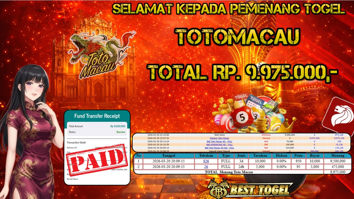 Selamat kepada User id : KBY****** Telah berhasil mendapatkan kemenangan besar pada permainan TOGEL TOTOMACAU dengan total kemenangan Sebesar Rp.9.975.000,– Setelah mengisi formulir withdraw dengan kurung waktu hanya 5 – 10 menit pihak BESTTOGEL sudah melakukan transfer kepada pemilik Userid dan dana sudah dapat di cairkan oleh pemenang. Bukti pembayaran yang kami berikan merupakan bukti pembayaran yang SAH / VALID yang langung di dapatkan melaui tanda transfer transaksi dari Bank yang di tuju.
