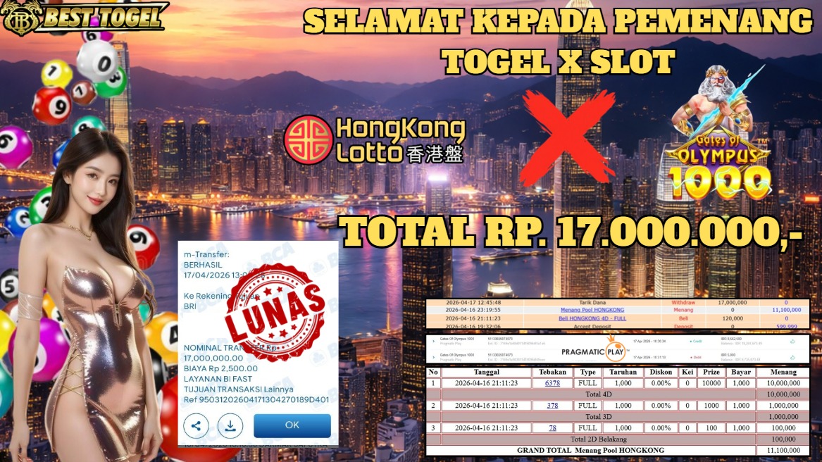 Selamat kepada User id : JAB*** Telah berhasil mendapatkan kemenangan besar pada permainanan TOGEL X SLOT HONGKONG LOTTO X GATES OF OLYMPUS 1000 dengan total kemenangan Sebesar Rp.17.000.000,- Setelah mengisi formulir withdraw dengan kurung waktu hanya 5 – 10 menit pihak  BESTTOGEL sudah melakukan transfer kepada pemilik Userid dan dana sudah dapat di cairkan oleh pemenang. Bukti pembayaran yang kami berikan merupakan bukti pembayaran yang SAH / VALID yang langung di dapatkan melaui tanda transfer transaksi dari Bank yang di tuju.Kami mengucapakan banyak Terima Kasih Kepada pemenang karena sudah mempercayakan kami sebagai Bandar Tepercaya yang membayar semua kemenangan member